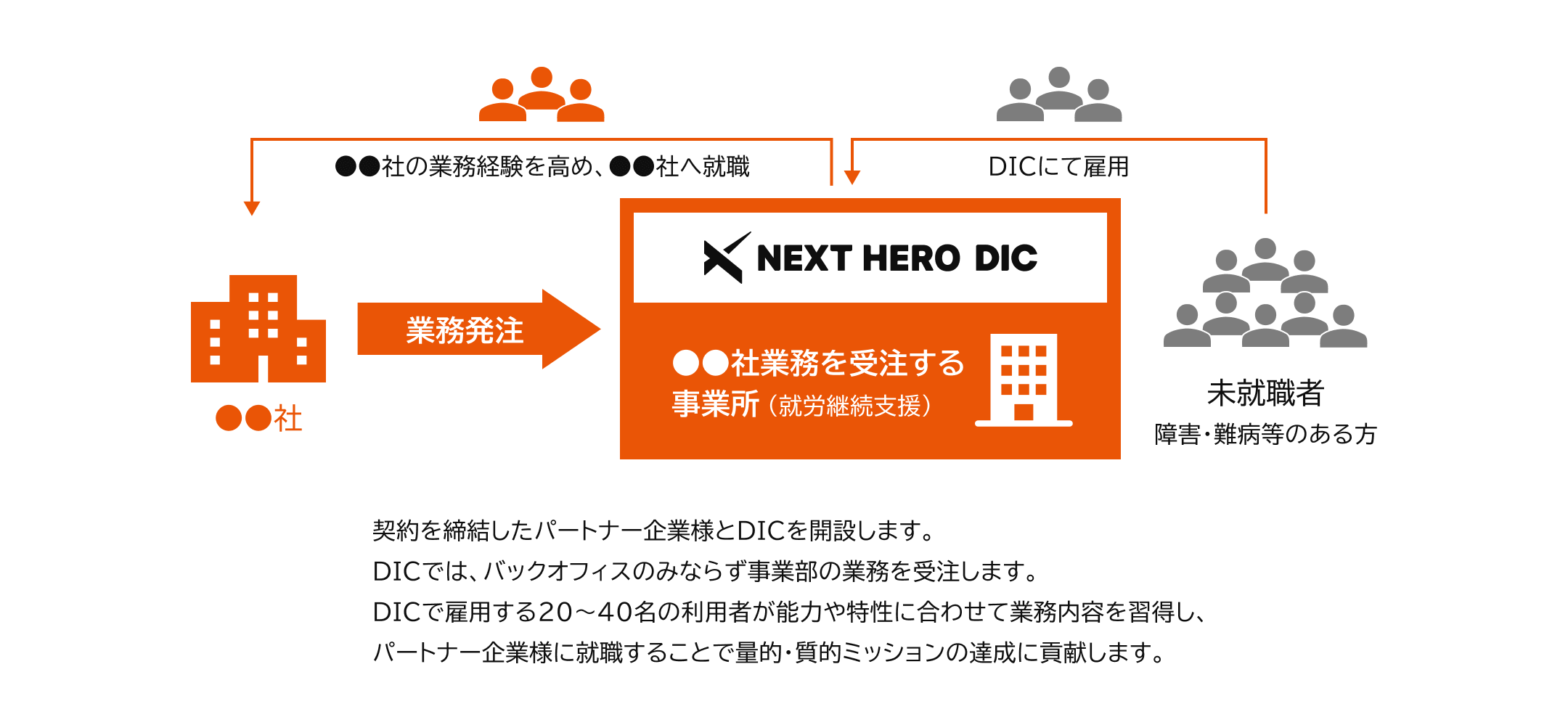 NEXT HERO DICは、パートナー企業様と就労継続支援事業所を開設することで、「採用する前」から実務を通じて育成できる、新たな雇用創出モデルです。