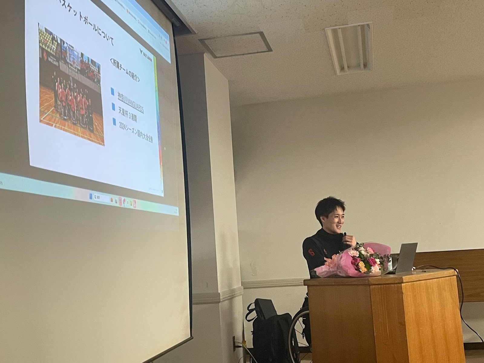 本講演では、スポーツ事故による脊髄損傷から車いすユーザーとなった現役車いすバスケットボール選手、前田柊(VALT JAPAN株式会社従業員)より、車いすユーザーになってからの人生の変化、目標を持つことの大切さについて話してもらいました。