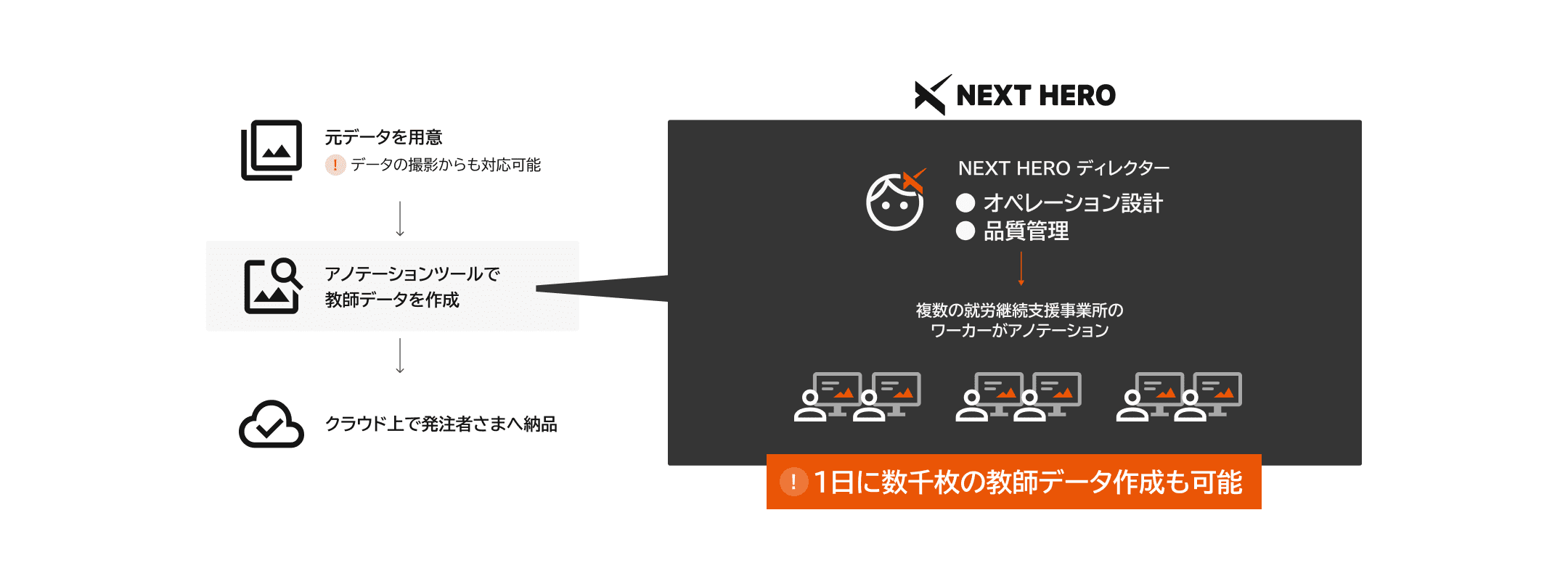 人工知能開発の成功には、質の高い学習データが不可欠です。NEXT HERO “AI-SX”は全国に15,000か所以上ある就労継続支援事業所をAIアノテーション代行センターとして構築。品質と納期の徹底管理、作業ボリュームにあわせた柔軟な対応によってアノテーション業務をサポートいたします。